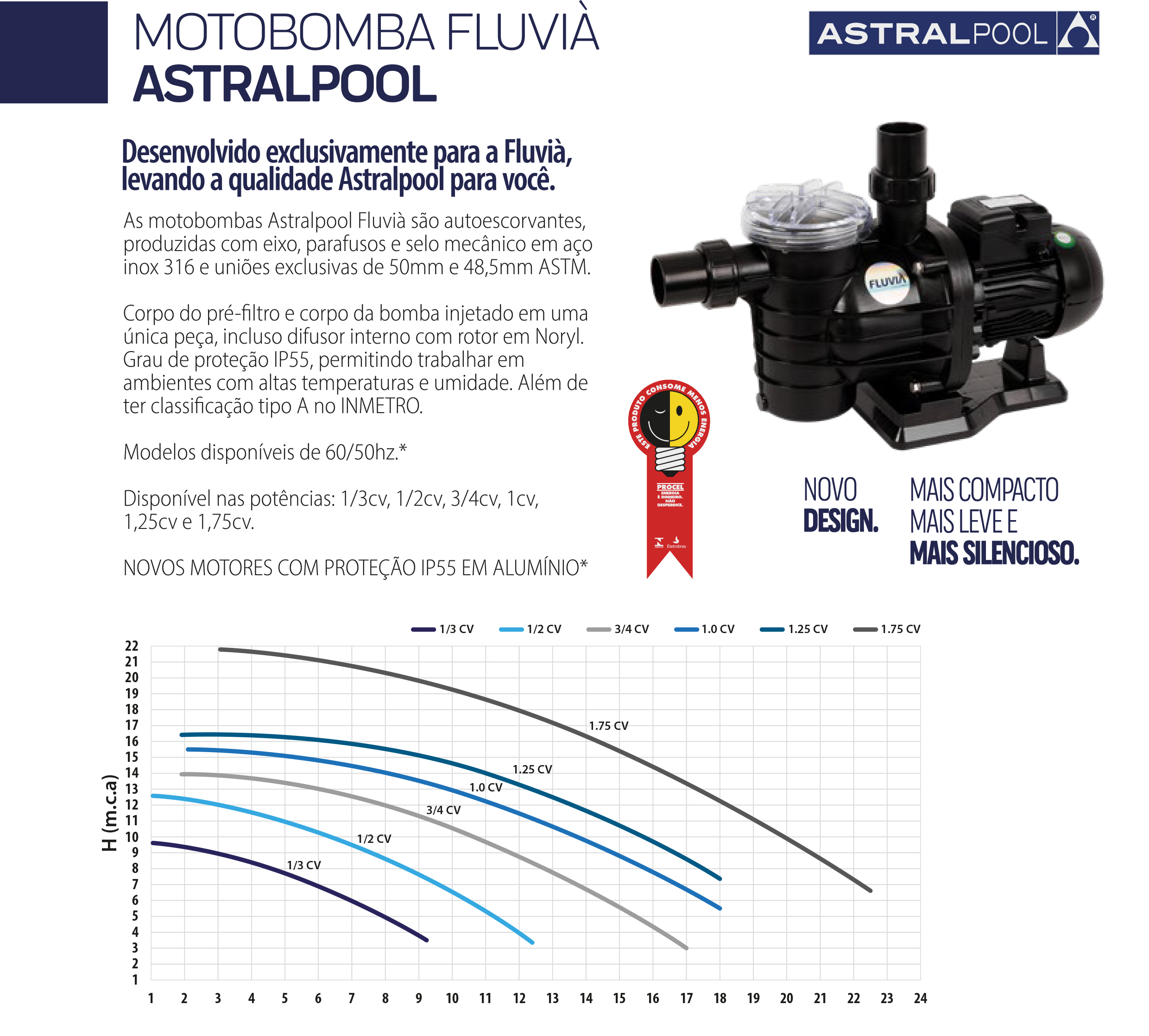 As motobombas Astralpool Fluvià são autoescorvantes, produzidas com eixo, parafusos e selo mecânico em aço inox 316 e uniões exclusivas de 50mm e 48,5mm ASTM.